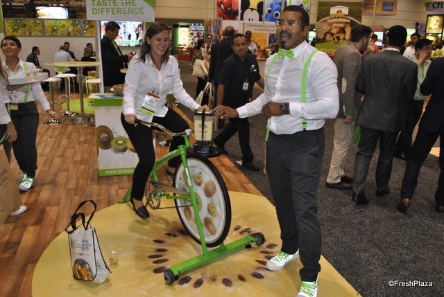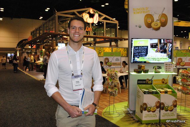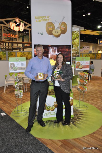 Lain Jager and Sarah Deaton from Zespri promote the Sungold kiwi variety, which is taking off very fast in United States. They have packaging with a “Spife” (spoon and knife) so it will be ready to eat.