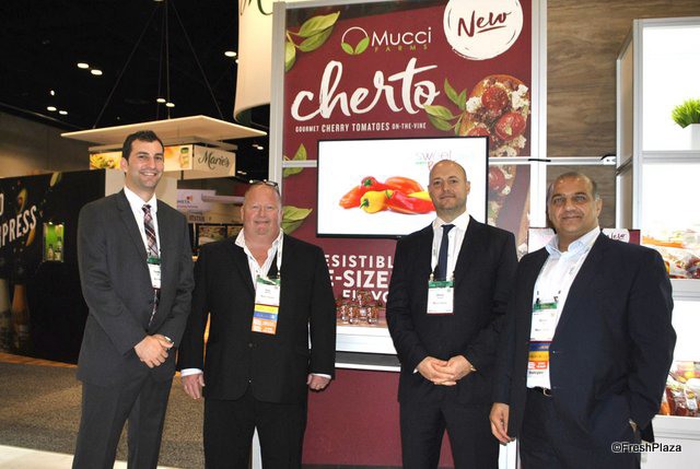 Stephen Cowan, Rob Medcalf, Steve Zaccardi and Danny Elias, Mucci Farms, with the new Cherto cherry tomato on the vine