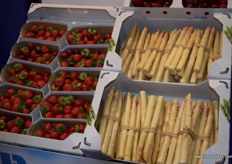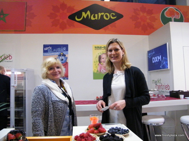 Sonja Lucker with a colleague at the Fresouer (Moroccan stand); fresh and frozen strawberries are the main products.