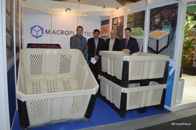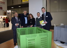 Macro Plastics proudly shows its 4-way fork entry base pallet as well as a new Shipper Bin. From left to right are Joop Kurver, Esteban Becerra, Rodney Salmon and Hugo Ramos.