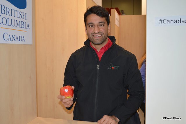 Rajiv Dasanjh with Summerland Varieties, showing the Ambrosia apple.