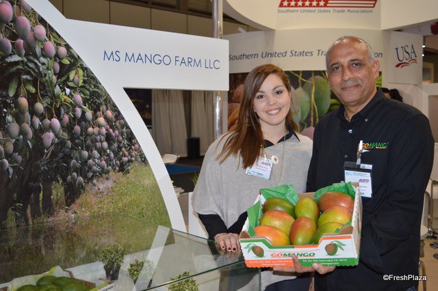 Damaris Rullan and Yoav Cohen showing Kent mangos from Puerto Rico.