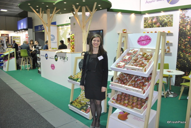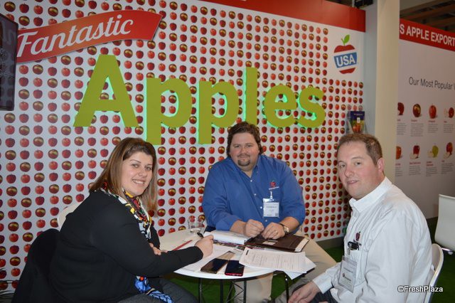 Marta Molla Insa visiting the booth of United Apples Sales with next to her Josh Tunstall and Brett Baker with United Apple Sales.