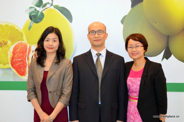 Cherry, Erin Huang and Steven Yang of Rayen, exporter of pomelo and citrus. Steven Yang is the general manager.