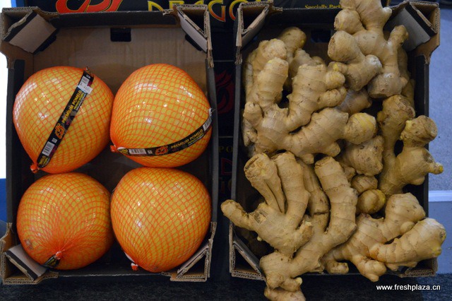 Pomelo and ginger for the European market by Jining Land Produce. The products are sold under the company's Red Dragon brand.
