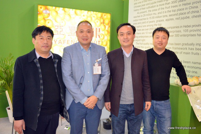 Left is Li Wenhong of Botou Yafeng, a pear grower and exporter from Hebei province in Northwest China. He is together with Yaohua Chen, Chairman of the Board at Foshan Fuyi Food (second from left), and Qi Lei and Liu Xiyuan, both export manager at Botou Yafeng.