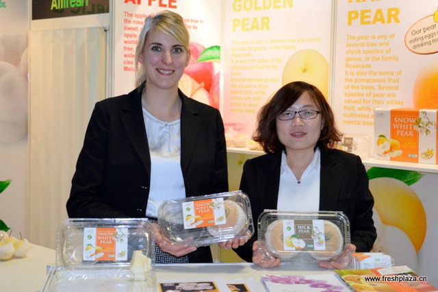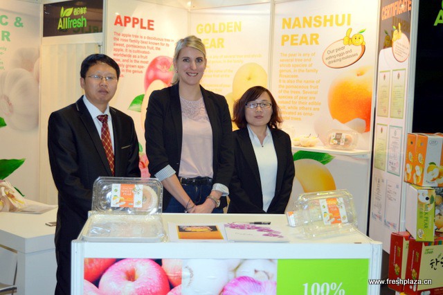 Field Nie and Judy Pang represent All Fresh Qingdao O'natur Bio-Tech, specialist in Chinese organic pears. In the middle is Kathrin Harden of Spettmann.