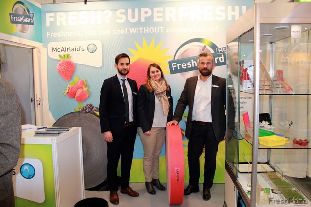 Tim Papendorf, Sandra Maier and Malte Stubbe from McAirlaid's Vliesstoffe GmbH present the new Fruitpad Freshguard HC, a product for optimal moisture content in berries, salads and herbs packaging.
