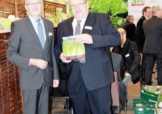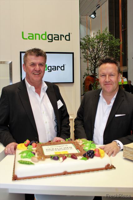 Bert Schmitz from Horticulture Schmitz and Landgard Chairman of the Board, Armin Rehberg, congratulate Fruit Logistica on their 25th anniversary with a wonderful cake.