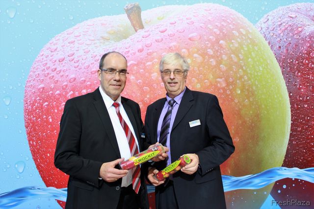 Frank Döscher, CEO of the Elbe-Fruit, proudly presents the Rock-it snacking apple together with Mr. zum Felde.