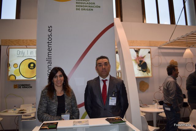 Ana Omedes and Samuel Sancho, at the stand of Melocotón de Calanda.