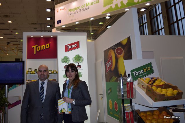 Stand of Tana, a Murcian company specialised in fresh and processed citrus products, with Blanca Martínez. They are now also marketing mangoes and avocados.
