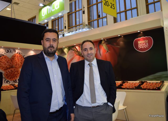 Francesc Llonch, manager of Gavà Grup, and Carles Mayol, Sales Manager of Port de Barcelona, at the stand of Monterosa, the tomato with a summer Mediterranean flavour which is harvested in winter.