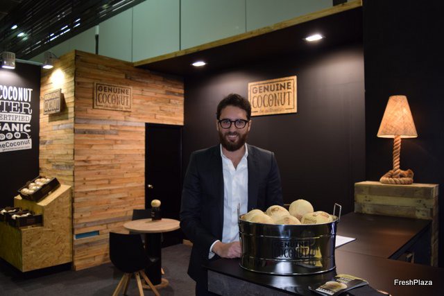 David Amorós, sales manager for the Middle East and North America at Genuine Coconut, showcasing the coconut water that won the Fruit Logistica Innovation award last year.