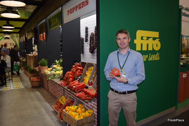 Tom Llombaerts, Production manager at Semillas Fitó, promoting Monterosa tomatoes, one of the products that has attracted the most interest at the fair.