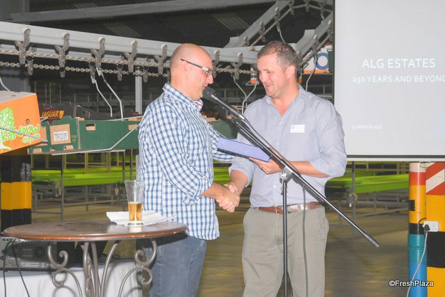 Jaguar, the Fresh Company, has maintained a business relationship with ALG for 18 years. Ed Heijnen of Jaguar receives an award from Gerrit van der Merwe Jr of ALG.