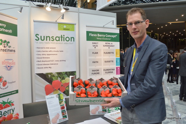 Marcel Suiker from Flevo Berry, presents the first Sunsation strawberries. These are the first batch of strawberries. The early variety distinguishes itself with its intense red colour and iconic shape.