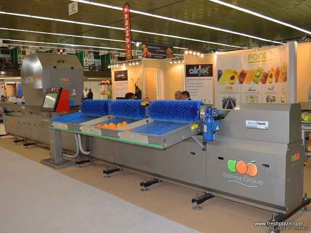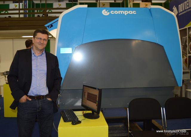 Owner Themis Pantelidis of Pantelidis; standing next to a Spectrim (sorting machine from New Zealand).