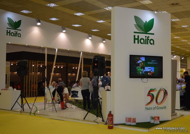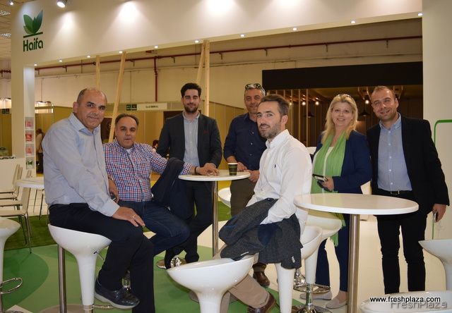 Sales Agronomist & Product Manager Vasilis Tsampardoukas (in white polo) with his team at the Haifa stand; Haifa is owned by an American Holding Company controlled by the Trump Group and it has 12 subsidiaries.