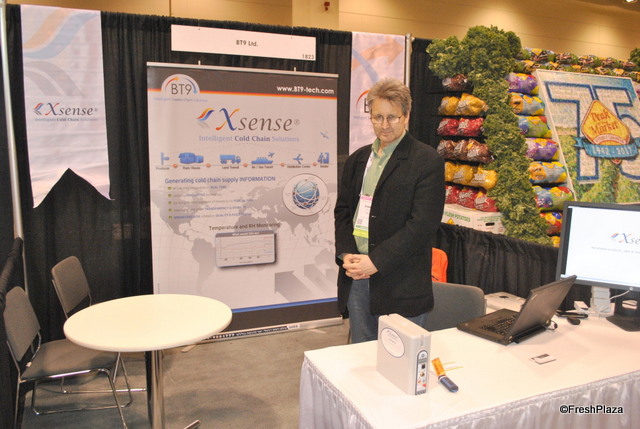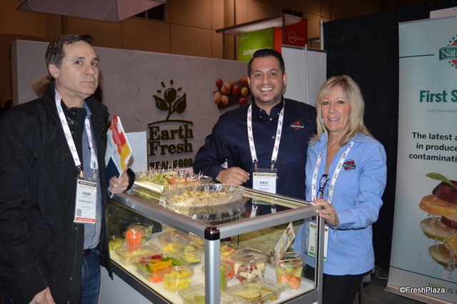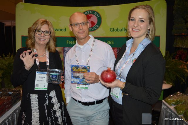 Sharon Robb with North Bay Produce show the Sophia jumbo blueberries that are named after the grower’s daughter. They are 22 mm. in size or larger and sourced from Mexico. Eric Olshove shows ready-to-eat blueberry snackpacks and Sarah Yancho shows pomegranates from Peru. The season will run through June.
