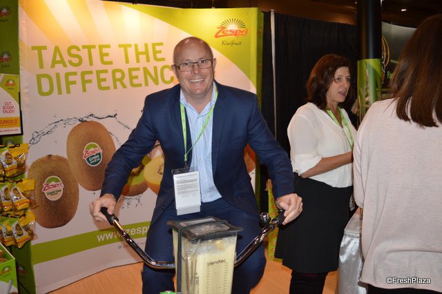 Glen Arrowsmith with Zespri is blending a SunGold kiwi fruit smoothie as he pedals on the bike.
