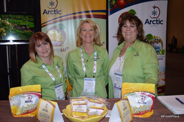 Jessica Brady, Jennifer Armen and Jeanette de-Coninck- Hertzler with Okanagan Specialty Fruits. On display are sliced are sliced Arctic apples as well as the new packaging for them.