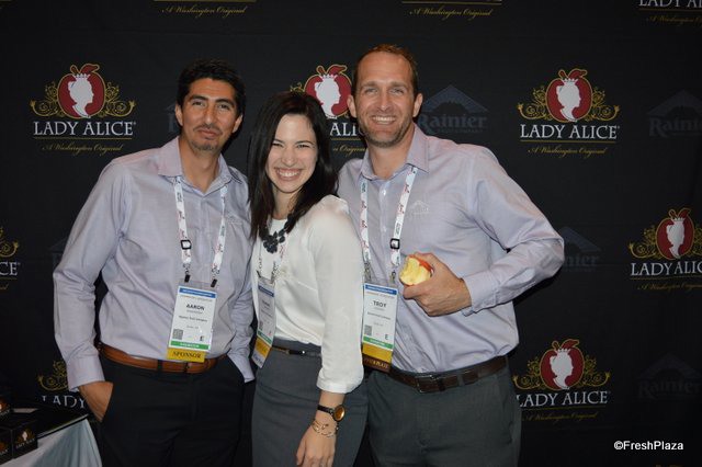 Eating an apple makes you happy. Smiles in the booth of Rainier Fruit with Aaron DeHerrera, Blaine Markley and Troy Howard.