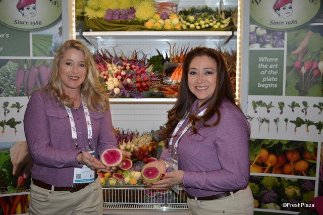 Ande Manos and Rocio Munoz with Babe Farms show watermelon radish that is grown in South Baja California. For a deep color, the product needs warm days and nights.