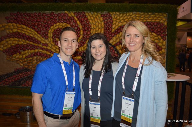 The team of EarthFresh Farms in front of a potato wall. From left to right Kevin Sorichetti, Lisa Kacur and Stephanie Cutaia.