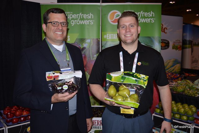 Mike Preacher and Ryan Cleary with Superfresh Growers. Mike shows a pouch bag with organic dark sweet cherries and Ryan holds a 3 lbs. pouch bag of D’Anjou pears.
