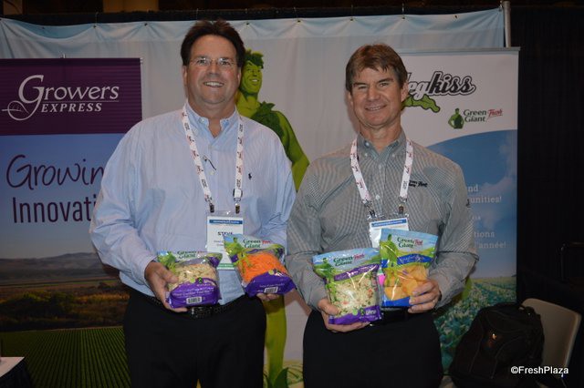 Steve Noll and Merritt Bruce of Growers Express show several new Green Giant products. Steve shows Cauliflower Crumbles Fried Rice and Sweet Potato noodles. Merritt shows the new Spaghetti Squash product that was launched at CPMA.