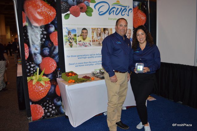 Vince Ferrante and Leslie Simmons with Dave’s Specialty Imports. Leslie is in blueberry style, showing a clamshell of blueberries and wearing blueberry shoes.