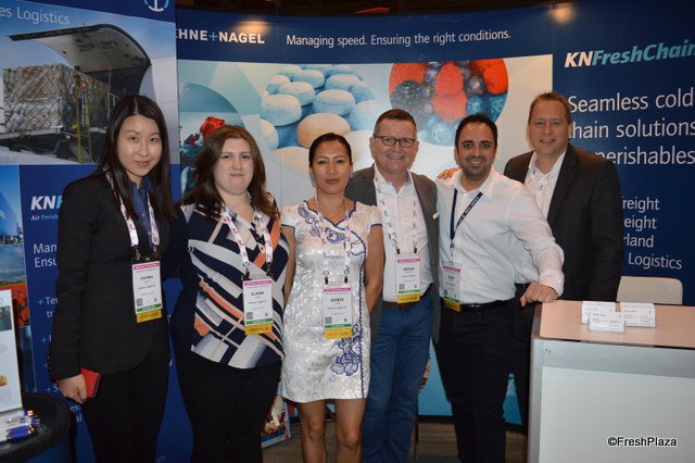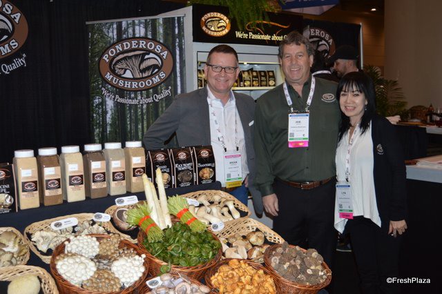 Brian Pederson of Kuehne + Nagel Ltc. is visiting the Stupendous Ponderosa Mushroom booth of Joe Salvo and Lyn Luu