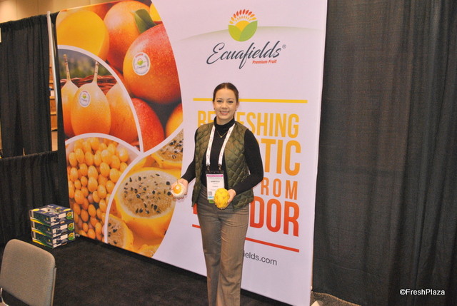 Gabriela Vallejo from Ecuafields promoting yellow passion fruit and dragon fruit