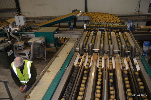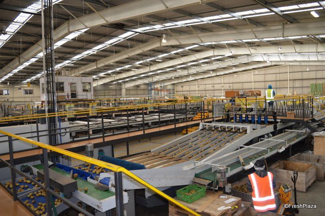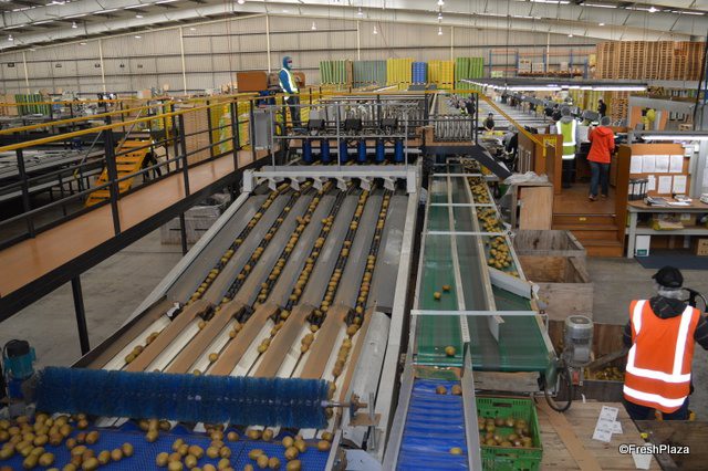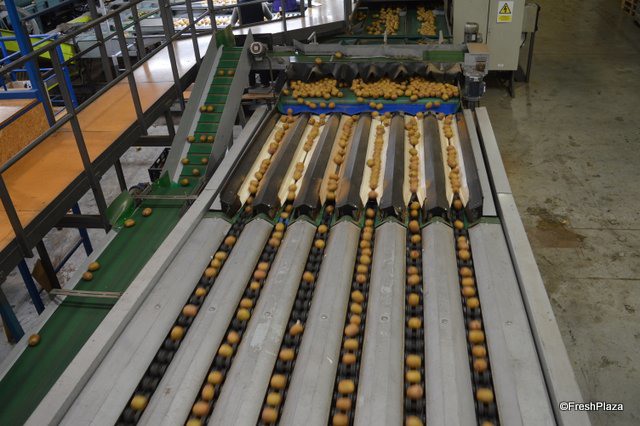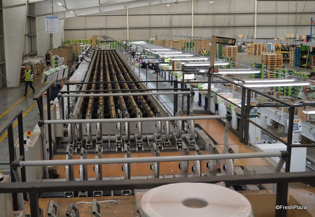 This dynamic drop machine sorts the fruit into the different sizes and then boxes it.