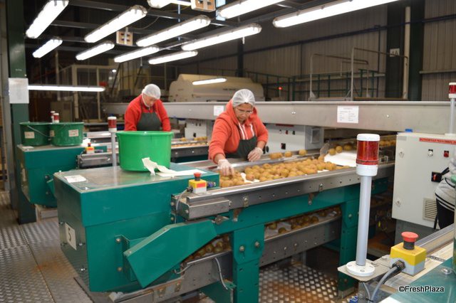 The workers rearrange the fruit before it it automatically put in the single layer trays.