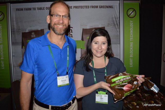 Derrick Rayner and Lisa Kacur with Earth Fresh Foods. Lisa shows a 3 lbs. light-blocking bag with organic red potatoes. The company finished a re-brand of its organic line 9 months ago.