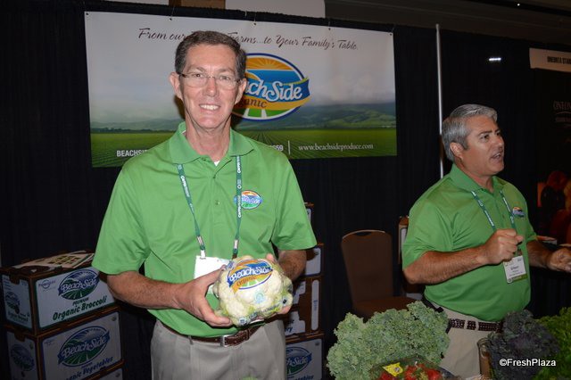 Bob Montgomery with BeachSide Produce shows organic cauliflower while his colleague Gilbert Hinojosa talks to visitors at the booth.