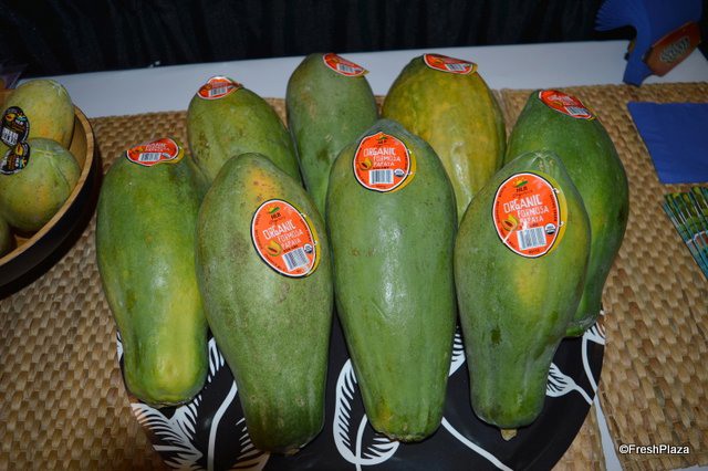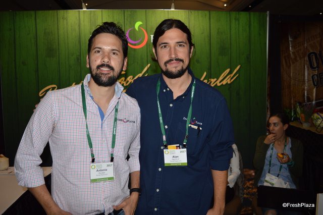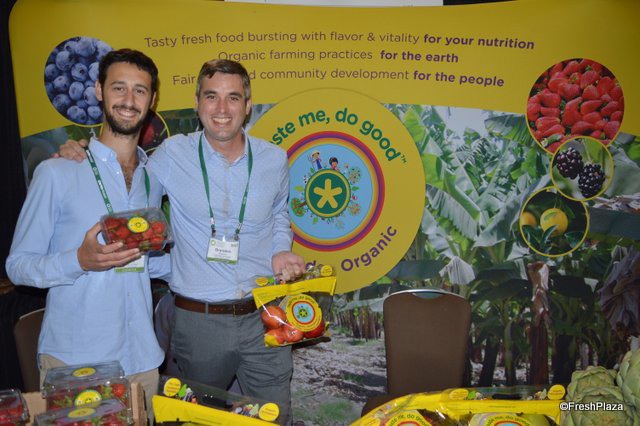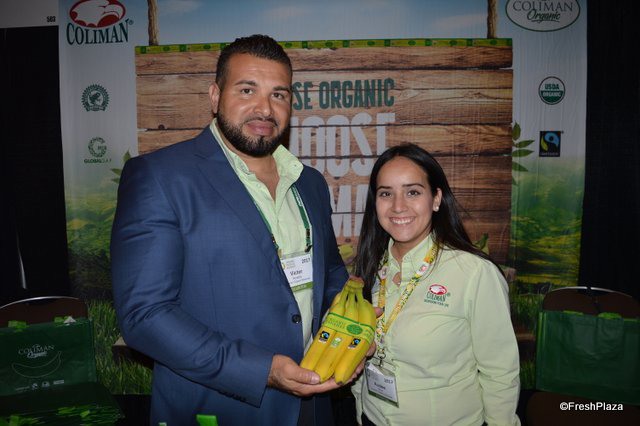 Victor Heredia Armendariz and Audee Rios Canobbio with Coliman proudly show organic fairtrade bananas. Victor shared that Coliman is the largest independent organic fairtrade & rainforest alliance certified banana grower in Latin America.