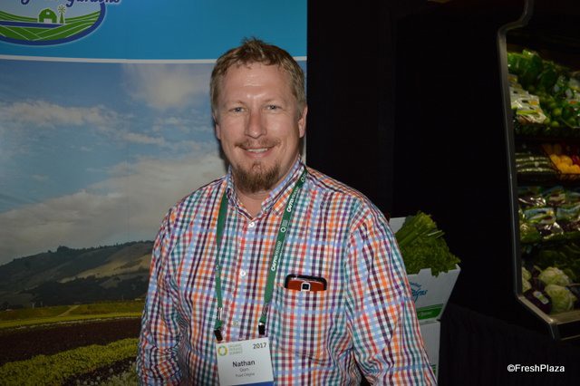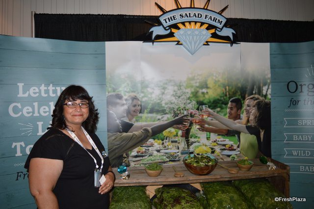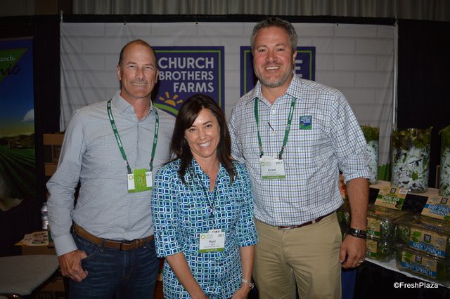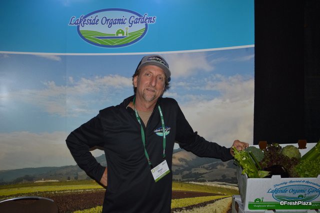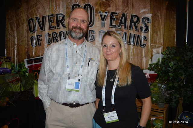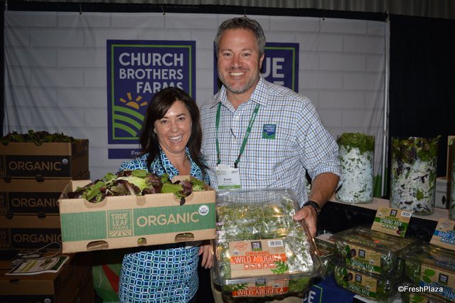 Kori Tuggle and Ernst van Eeghen with Church Brothers. Kori shows organic lettuce for foodservice while Ernst shows a retail pack of organic lettuce. For Ernst it was his third day in the job after re-joining Church Brothers.