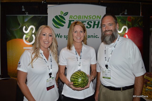 Jamie Sgheiza, Lara Grossman and John Pursel with Robinson Fresh show an organic mini watermelon as the watermelon season is coming up. The company's organic division is called Tomorrow's Organics.