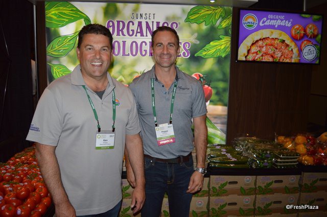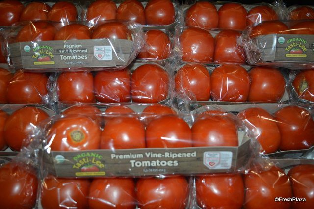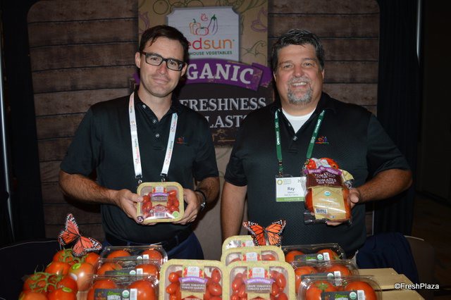 Organic grape tomatoes and organic tomatoes on the vine shown by Kyle Moynahan and Ray Mason with RedSun Farms.