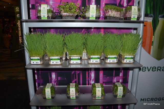 Organic microgreens and organic wheatgrass from Urban Produce on display. The company grows its products organically only.