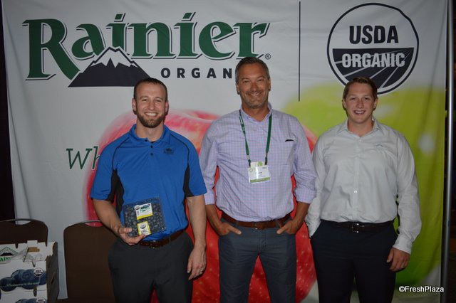 Tyler Johnson, Blake Belknap and Skyler McFeeley with Rainier. Tyler shows an 18 oz. clamshell with organic blueberries.