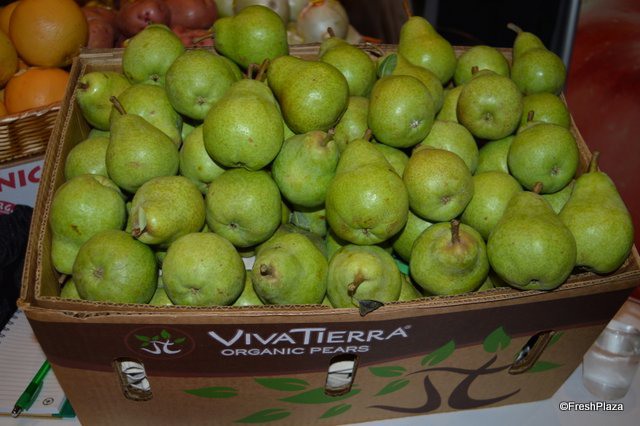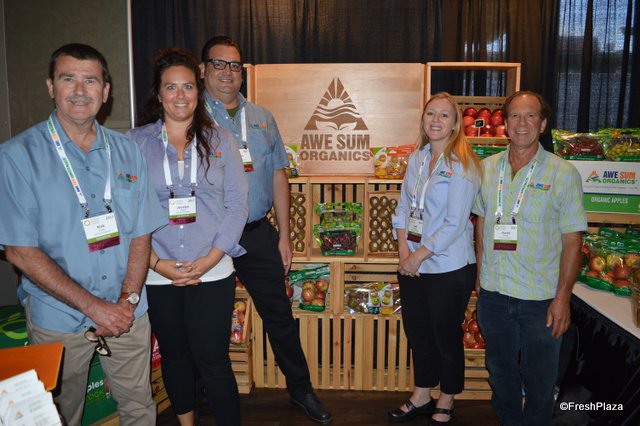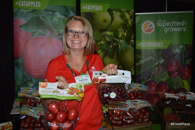 Catherine Gipe-Stewart with Domex Superfresh Growers shows organic Autumn Glory apples as well as organic sweet cherries.