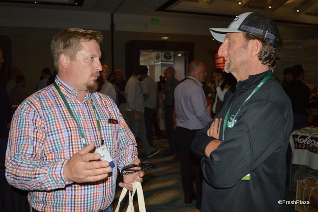 John Janker of Charlie's Produce is talking with Sunset/Mastronardi's Ken Silveira.