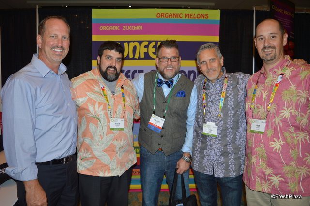 Retailer Raley's was visiting SunFed's booth. Larry Tucker with Raley's, Frank Camera with SunFed, Michael Schutt with Raley's and Craig Slate & Matt Mandel with SunFed.
