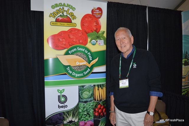 Michael Ryshouwer with Bejo Seeds has organic Tasti- Lee tomatoes on display, but also talks to attendees about the company's organic seed program.