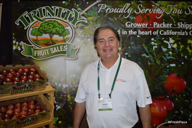 Levon Ganajian of Trinity Fruit has organic stone fruit on display, which is in peak season right now.