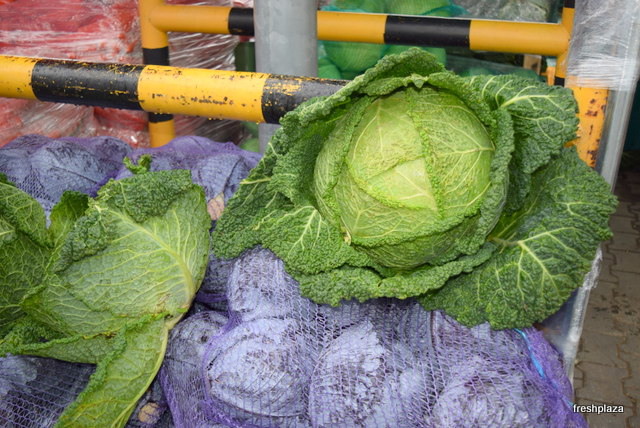 Large cabbage for sale, almost twice the size of an average cabbage found in stores. The purple cabbage, gives an indication of the size.